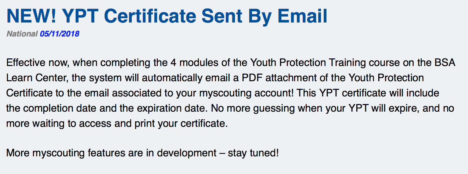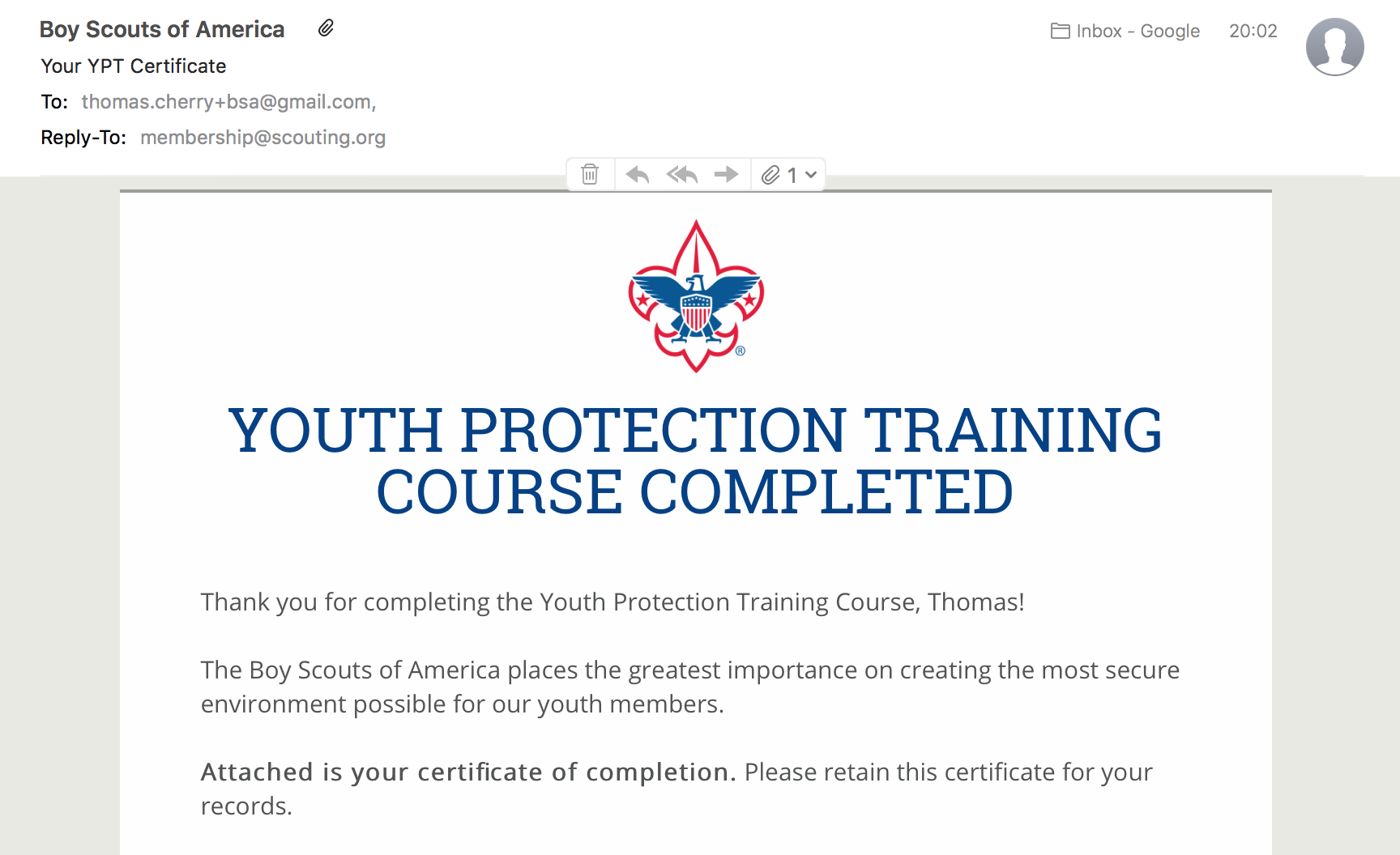 Check your email, and your spam folder, you should get an email with in minutes. Look for the title "Your YPT Certificate" from membership@scouting.org.
